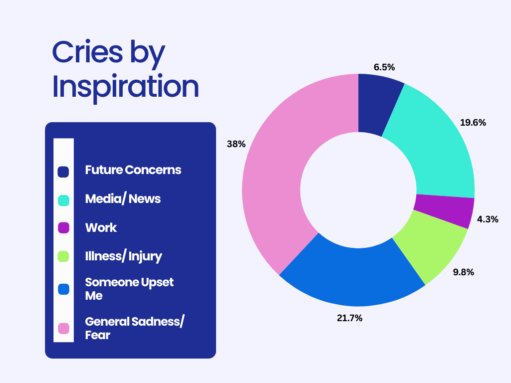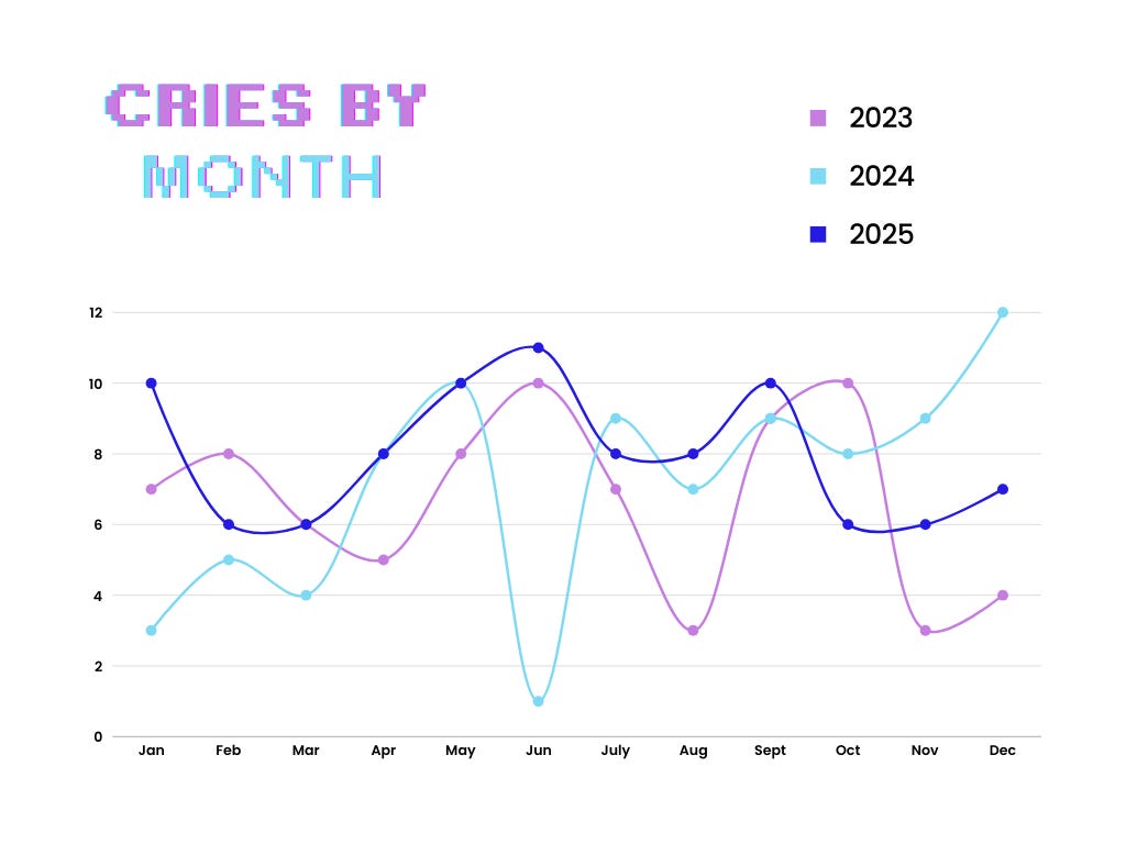 At this point, I have enough information to create a compelling line graph that suggests trends from month to month/over the years. As expected, I cry a little more during the summer because I overheat and get grouchy, except for June 2024 when I cried once??? That does not seem right. And, as I did last year, I assembled a pie chart to track the reasonings that inspired the most upsets this year.