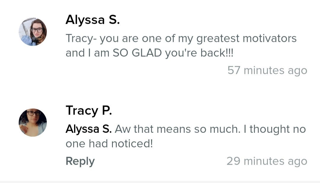 And I really liked Fitbit games. Absolute strangers invited me to rounds of Fitbit Bingo, where fitness accomplishments could be applied to tick Bingo board spaces. If I could take enough steps, log enough consecutive activity minutes, travel farthest distances, I could maybe win a Bingo round against Kim, someone with an orange Care Bear as their profile photo. Sometimes I would add another consistent virtual Bingo participant as a Fitbit “friend” and that’s how I connected with Tracy P.