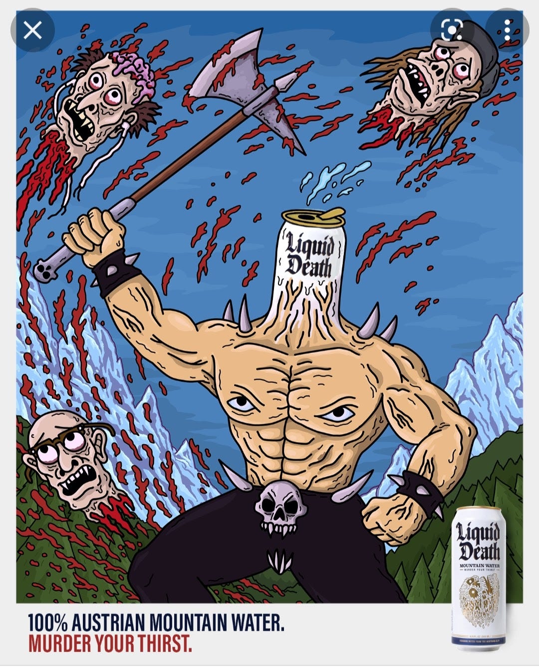 “Murder your thirst” asserts each can, displaying the company’s motto. They’ve sold water cursed by demons (accompanied by instruction to perform exorcisms- something I would have been interested in as a child deeply afraid of demon possession). They hired a 6-year-old child to design a t-shirt logo. They offer an extensive line of merch including a $6,200 water vending machine and a $68 nightlight. They use negative comments and reviews in their ads. They sold skateboards painted with their logo using some of Tony Hawk’s blood. Some of their ads merely assert “don’t buy this.” Mike Cessario says he’s not playing by traditional marketing rules, but the trend of edgier marketing strategies has been on the up for some time. That Purple mattress commercial with the sasquatch, fast food accounts roasting everyone on Twitter, and that Quizno’s commercial with the rat-adjacent creature come to mind quickly. I think about this commercial almost every day. All existed prior to three years ago when Liquid Death hit the shelves and the internet. I love a unique idea and bizarre ads are more fun, but I’m hesitant to credit Cessario as the ultimate pioneer as he claims. Maybe he has a leg up on much of his competition for ads that inspire shock and outrage.