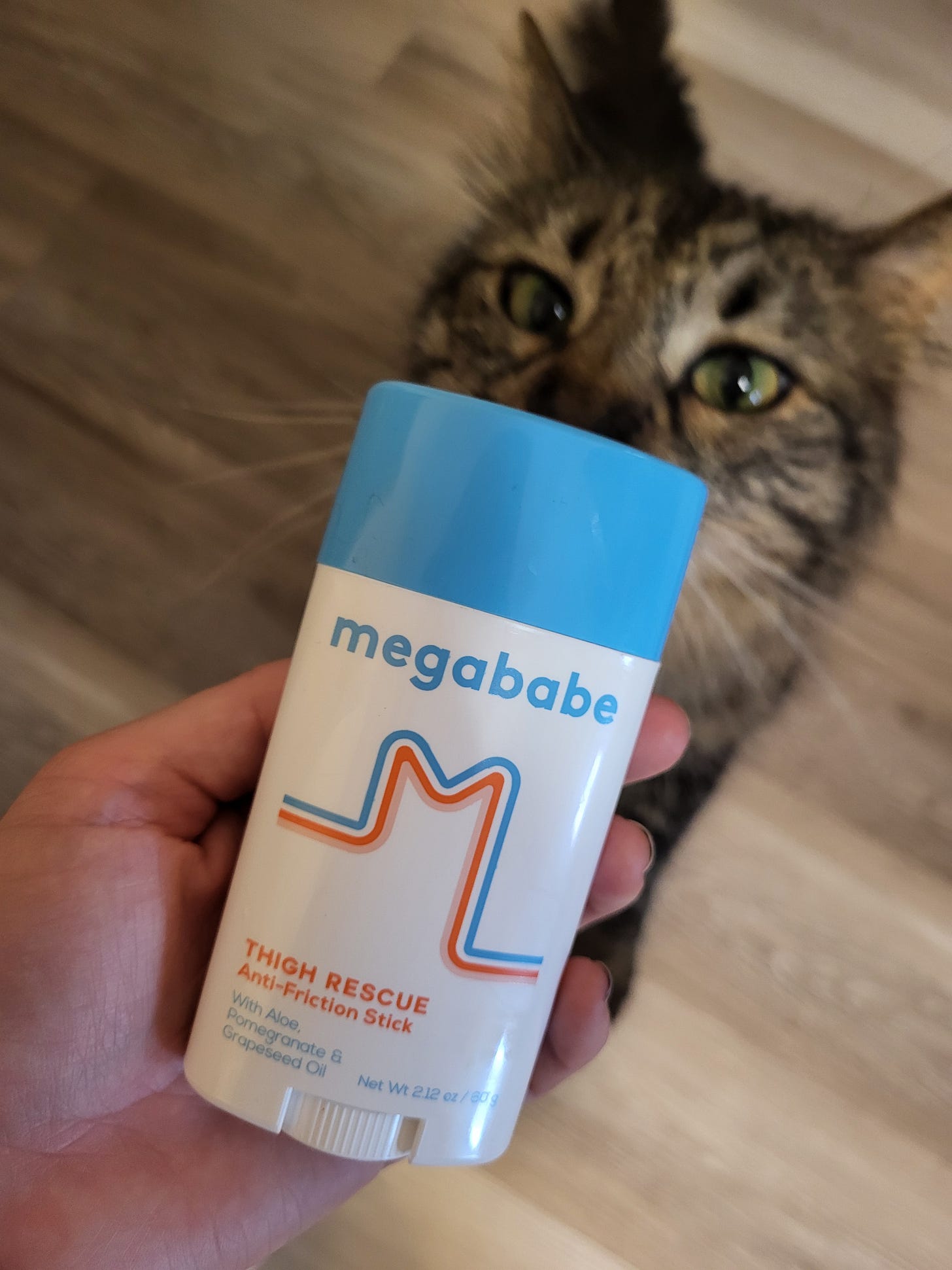 This is the first thigh friction relief product I ever met, and for a while I was a loyalist. Gold Bond has earned a space in my mind as safe and reliable, and this is a compact and portable stick. And it’s consistent. But unfortunately, it sometimes needs to be reapplied during the day, so the travel-ability of it matters. Unless you’ve planned strategically for reapplication, your level of pride matters, too. I have applied this specific product to the insides of my legs street-side and lived to regret being so shameless.